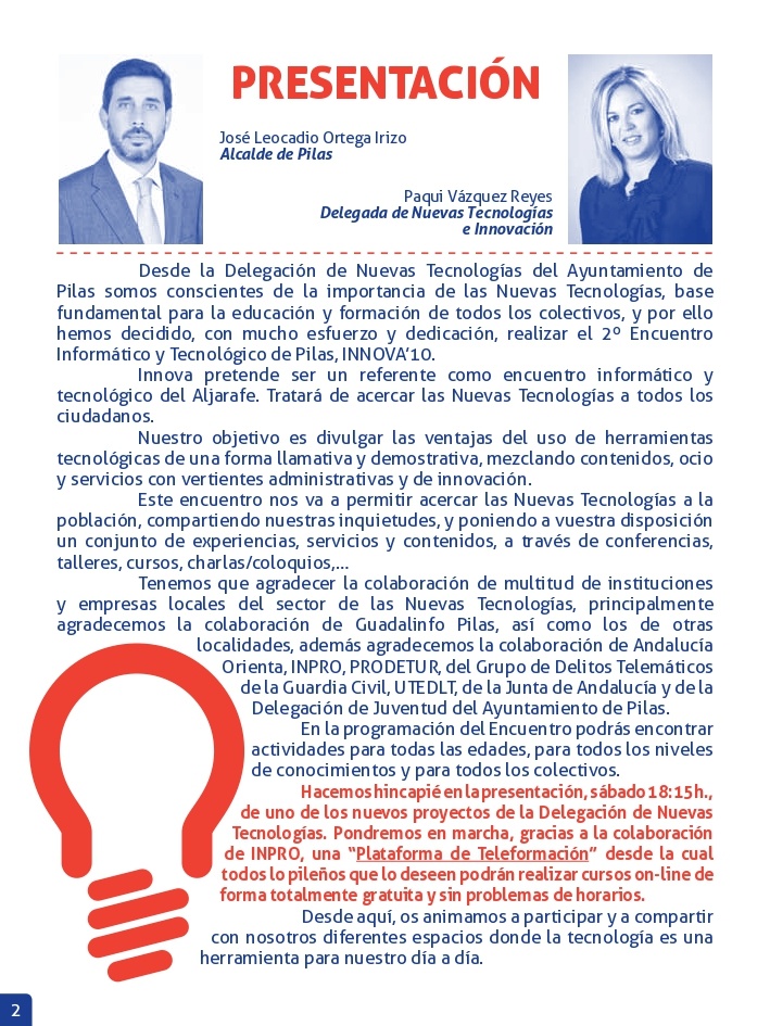 Desde la Delegación de Nuevas Tecnologías del Ayuntamiento de Pilas somos conscientes de la importancia de las Nuevas Tecnologías, base fundamental para la educación y formación de todos los colectivos, y por ello hemos decidido, con mucho esfuerzo y dedicación, realizar el 2º Encuentro Informático y Tecnológico de Pilas, INNOVA’10.