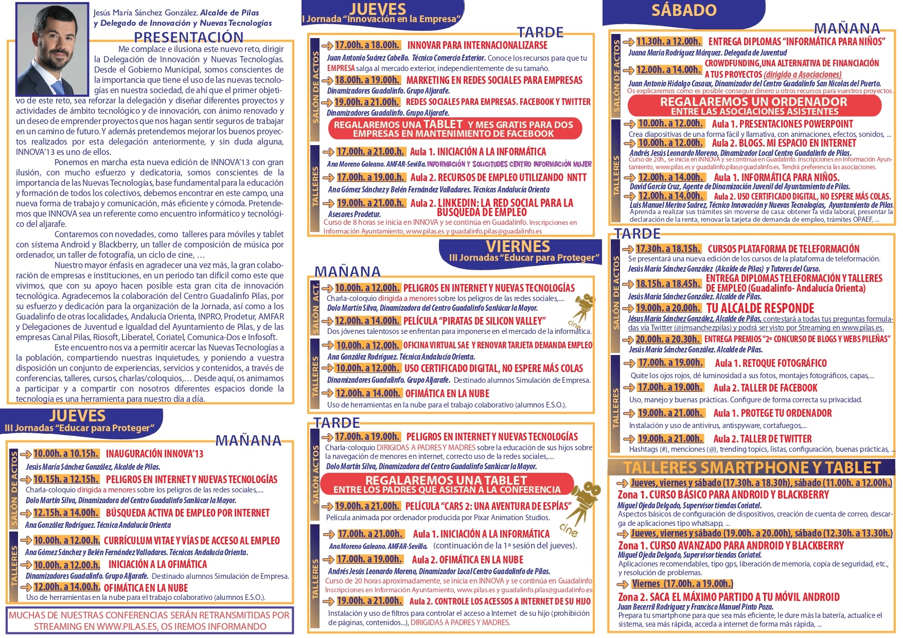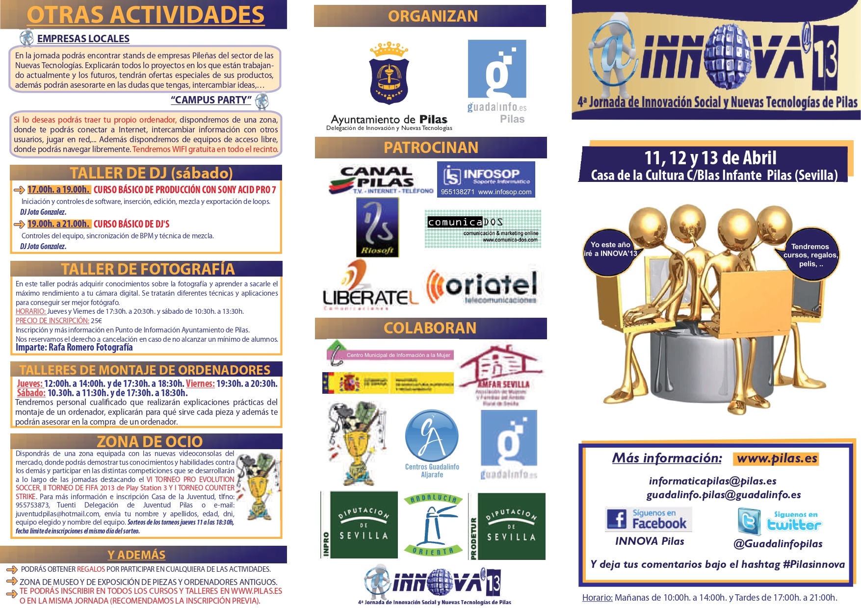 Ponemos en marcha esta nueva edición de INNOVA’13 con gran ilusión, con mucho esfuerzo y dedicatoria, somos conscientes de la importancia de las Nuevas Tecnologías, base fundamental para la educación y formación de todos los colectivos, debemos encontrar en este campo, una nueva forma de trabajo y comunicación, más e*ciente y cómoda. Pretendemos que INNOVA sea un referente como encuentro informático y tecnológico del aljarafe