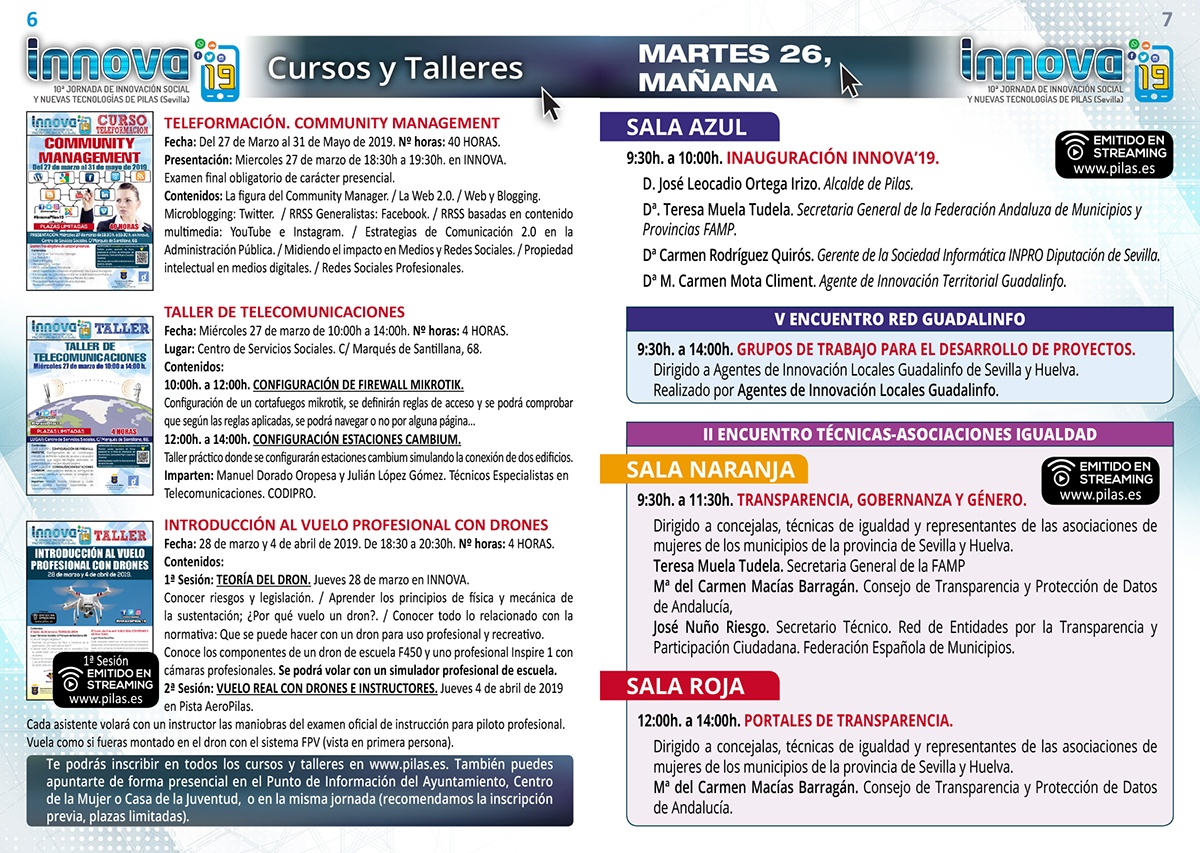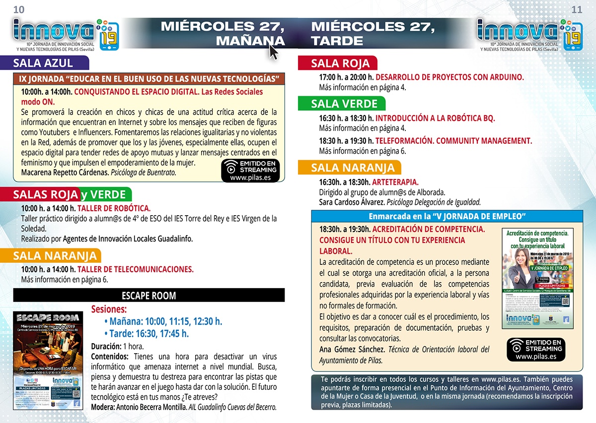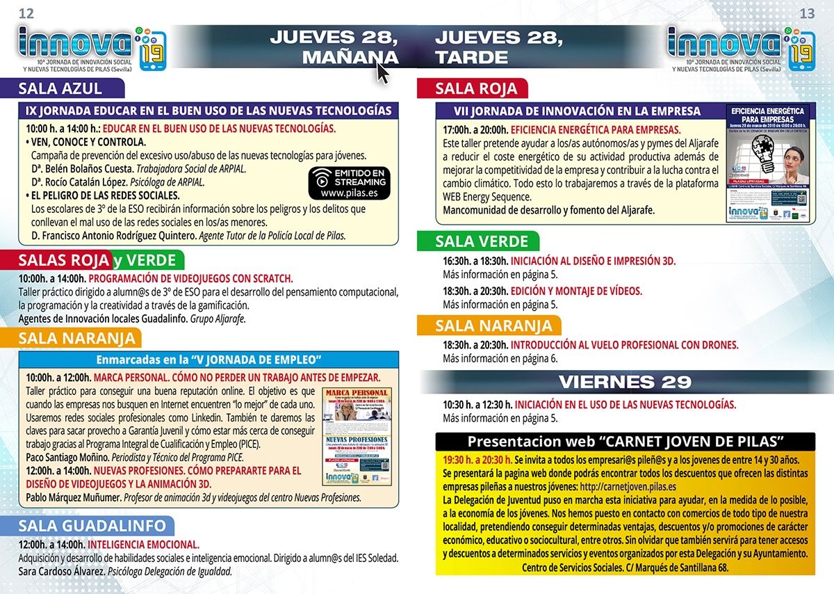 Un sinfín de temáticas, que se abordarán en estos días con destinatarios/as de muy diversa indole como juventud, mujer, profesionales de la informática, de la red Guadalinfo (Consorcio Fernando de los Rios), técnicos/as del ayuntamiento, empresarios/as, vecinos y vecinas en general que encuentran en este foro un espacio para y la formación, el emprendimiento y el intercambio de experiencias en sectores con gran proyeccion y futuro.