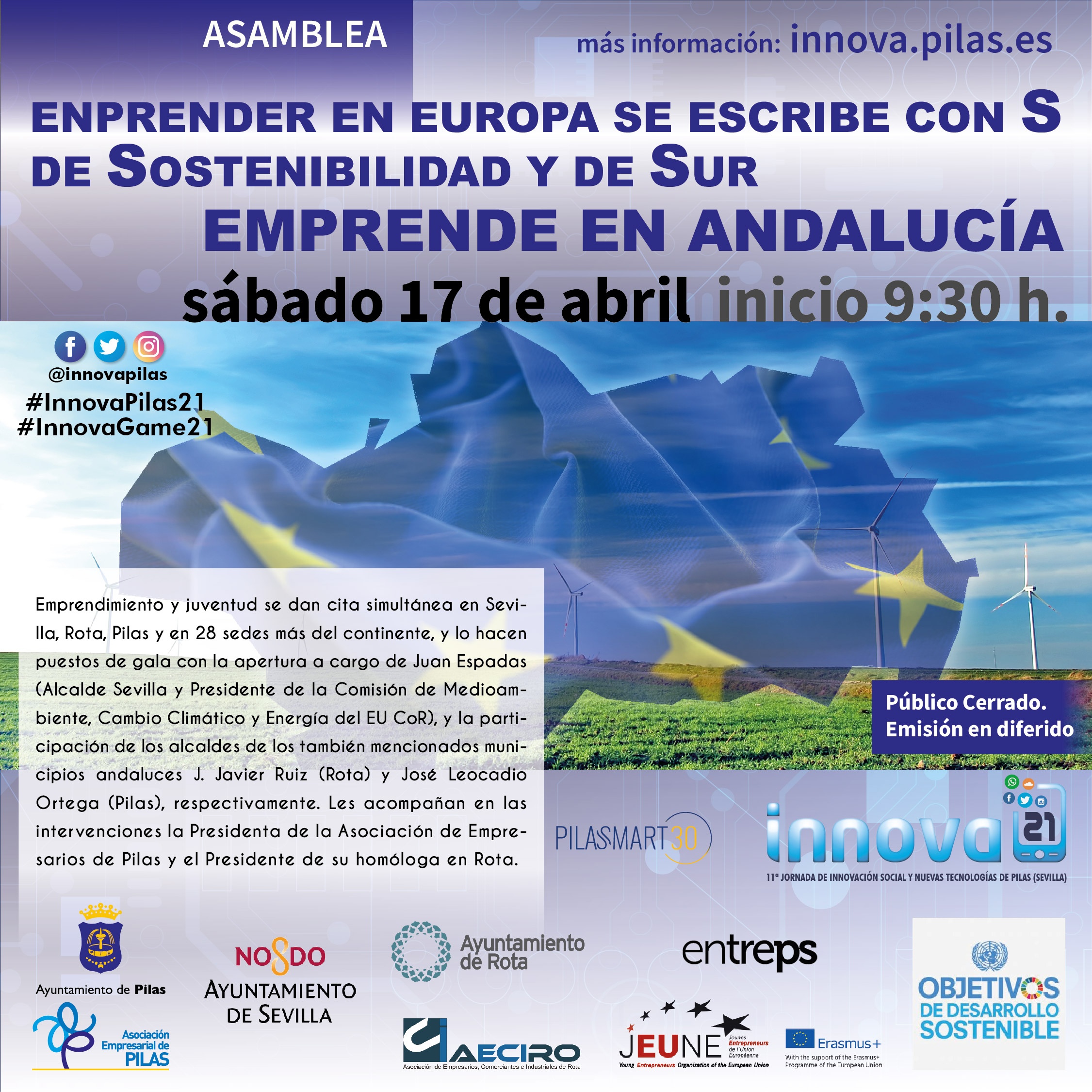 Emprendimiento y juventud se dan cita simultánea en Sevilla, Rota, Pilas y en 28 sedes más del continente, y lo hacen puestos de gala con la apertura a cargo de Juan Espadas (Alcalde de Sevilla y Presidente de la Comisión de Medioambiente, Cambio Climático y Energía del EU CoR), y la participación de los alcaldes de los también mencionados municipios andaluces J. Javier Ruiz (Rota) y José Leocadio Ortega (Pilas), respectivamente. Les acompañan en las intervenciones la Presidenta de la Asociación de Empresarios de Pilas y el Presidente de su homóloga en Rota.