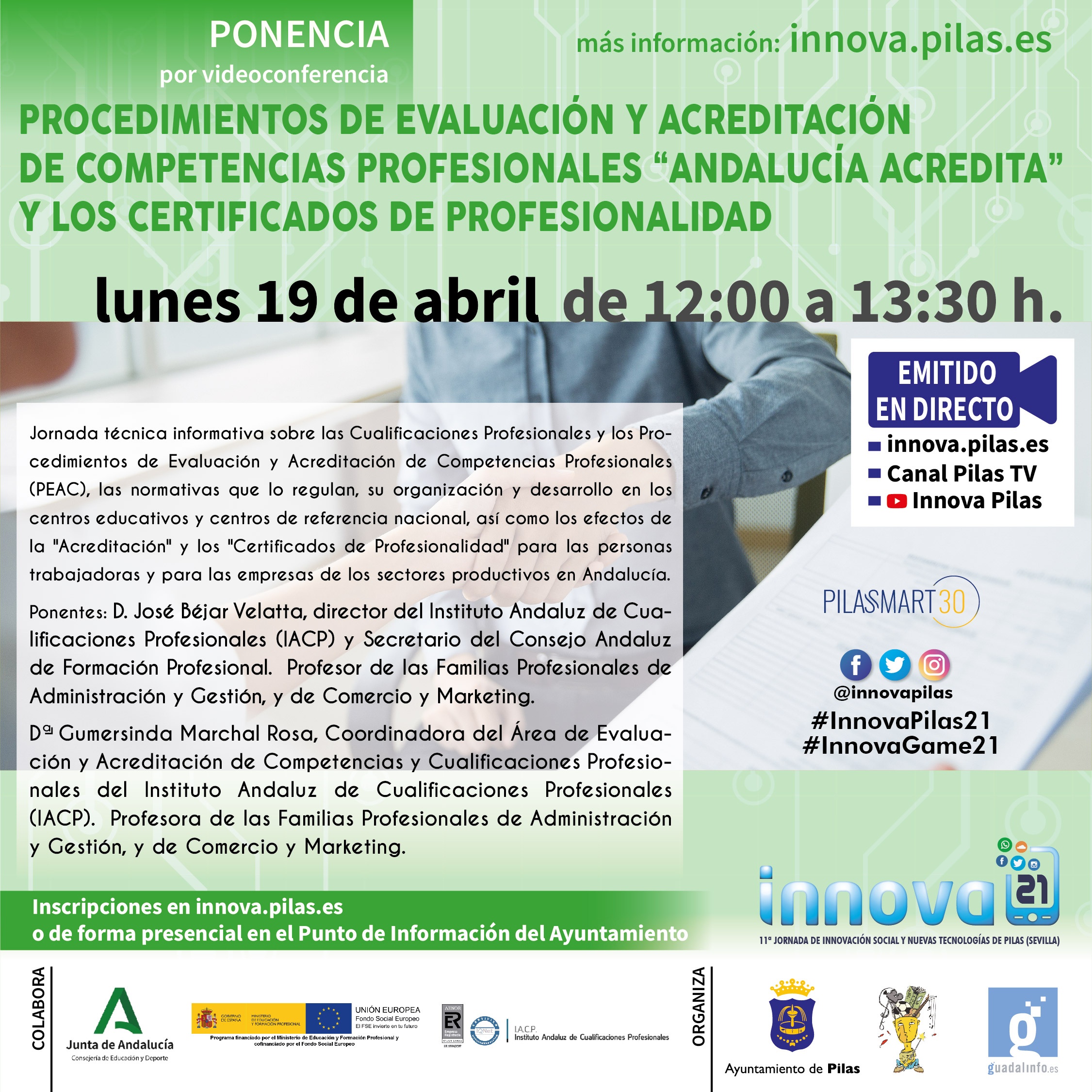 Durante la emisión podrás dejarnos tus comentarios y/o preguntas a través de Twitter con el Hashtag #InnovaPilas21 o vía whatsapp en el 602 29 38 03
