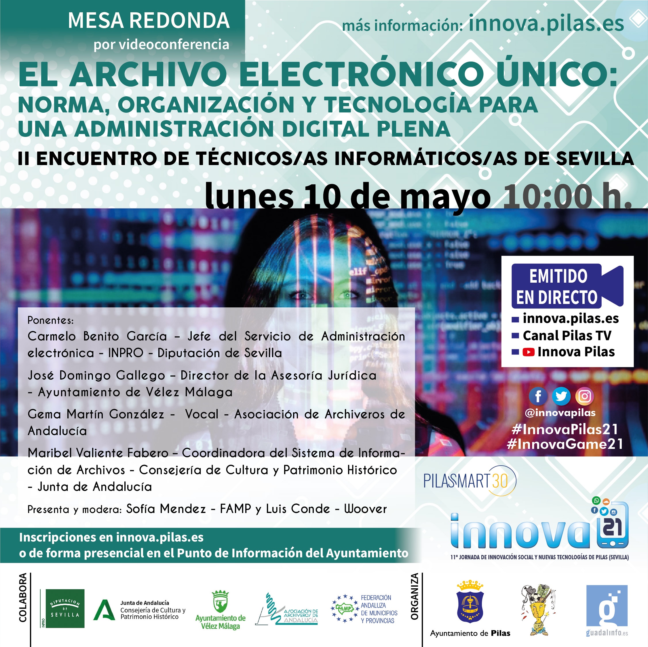 | Ponentes: | Carmelo Benito García – Jefe del Servicio de Administración electrónica - INPRO - Diputación de Sevilla José Domingo Gallego – Director de la Asesoría Jurídica - Ayuntamiento de Vélez Málaga Gema Martín González - Vocal - Asociación de Archiveros de Andalucía Maribel Valiente Fabero – Coordinadora del Sistema de Información de Archivos - Consejería de Cultura y Patrimonio Histórico - Junta de Andalucía |